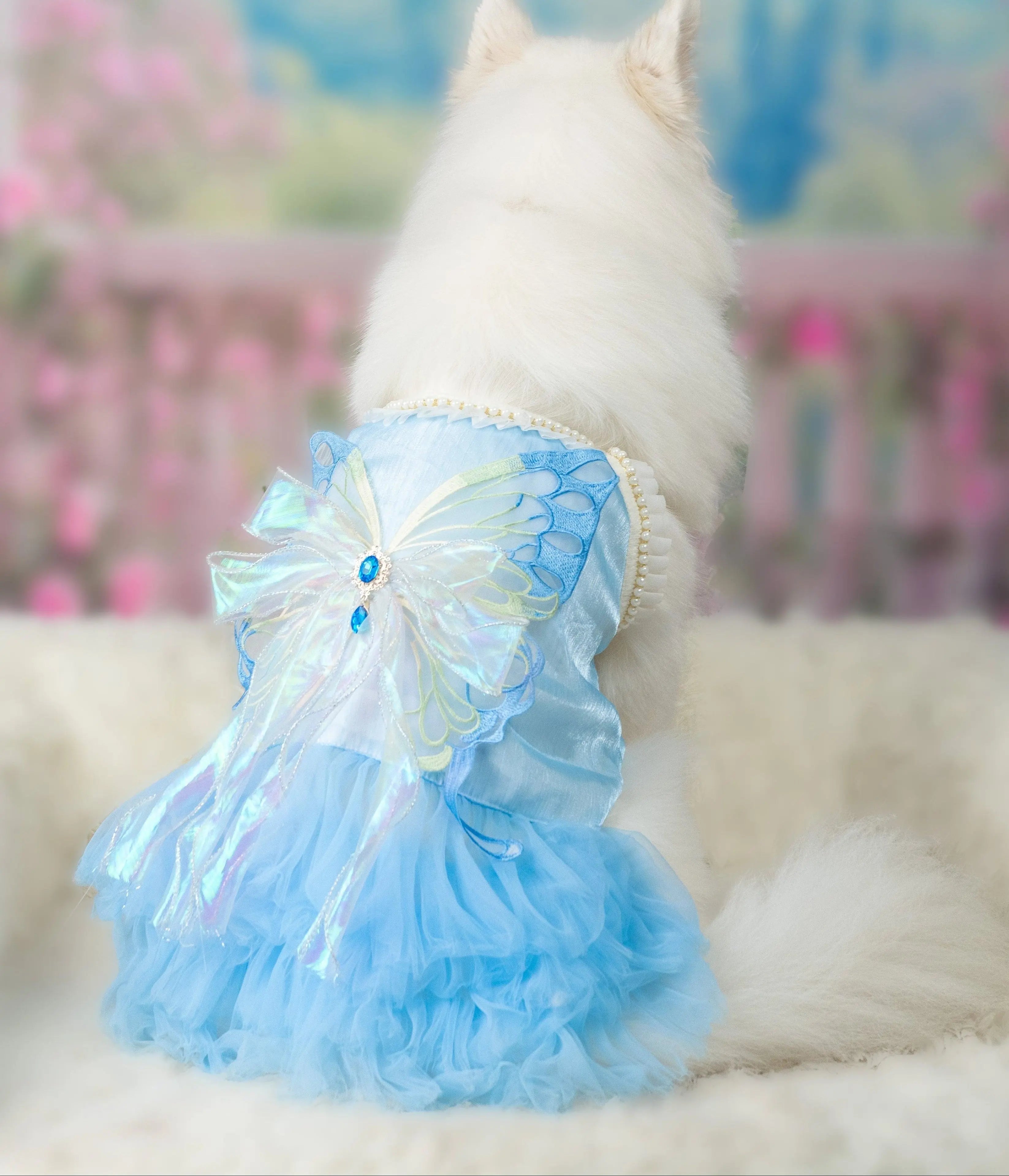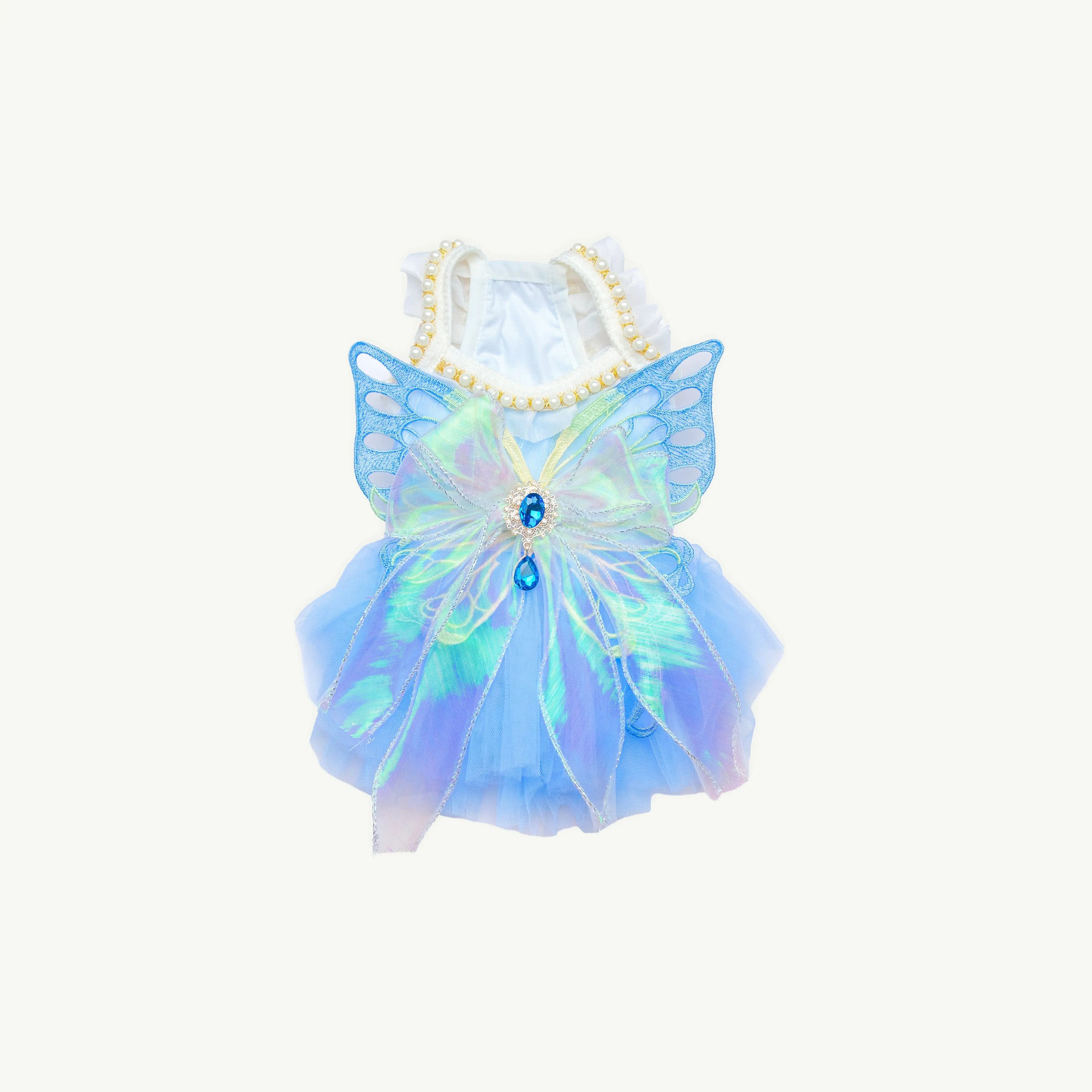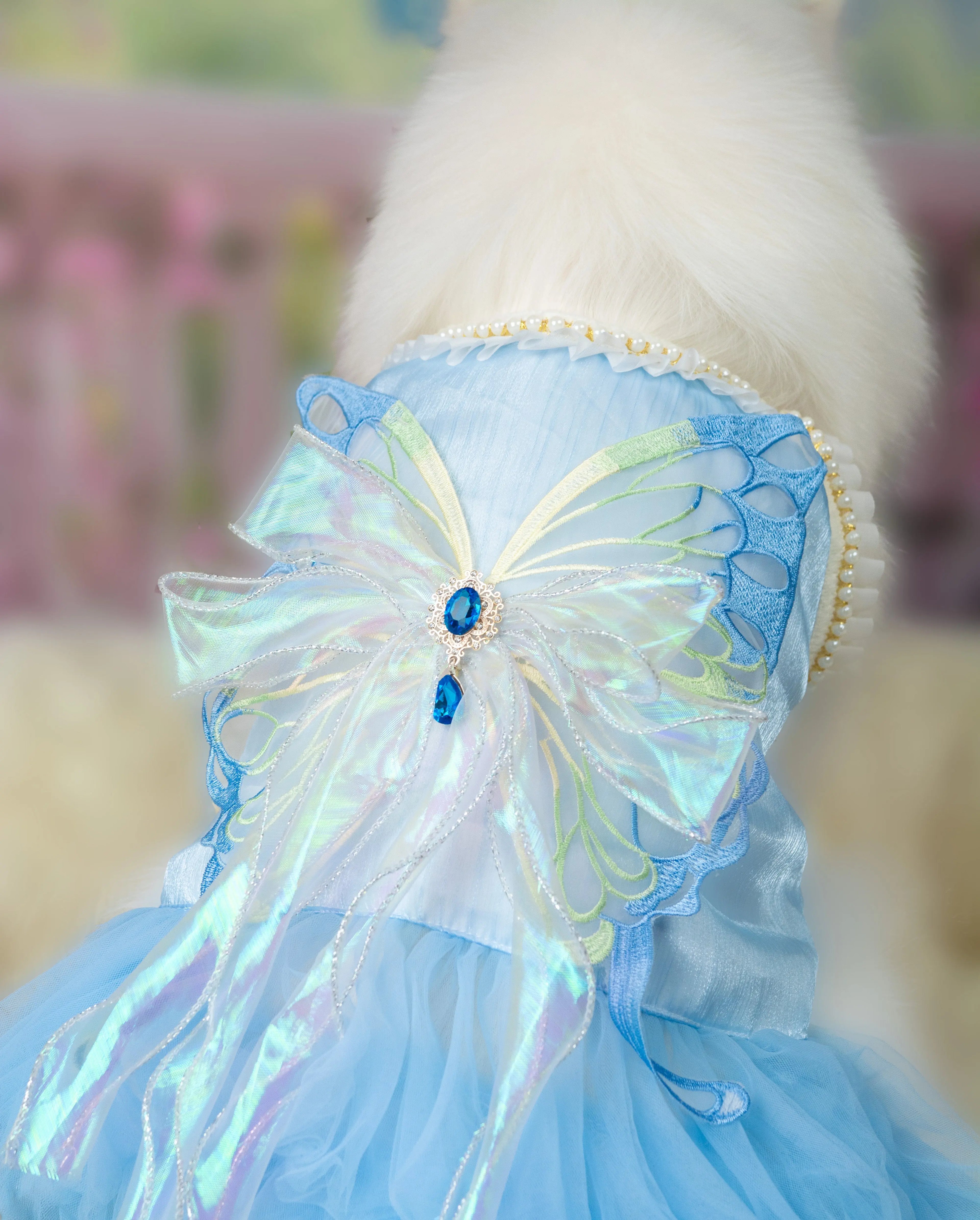 The bodice features a luminous iridescent butterfly applique detailed with embroidered wings, layered organza ribbons, and a sapphire-toned jewel centerpiece. Delicate pearl trimming frames the neckline with a polished, regal touch, while the cascading tulle skirt adds plush volume with a cloudlike texture that moves beautifully with every step.