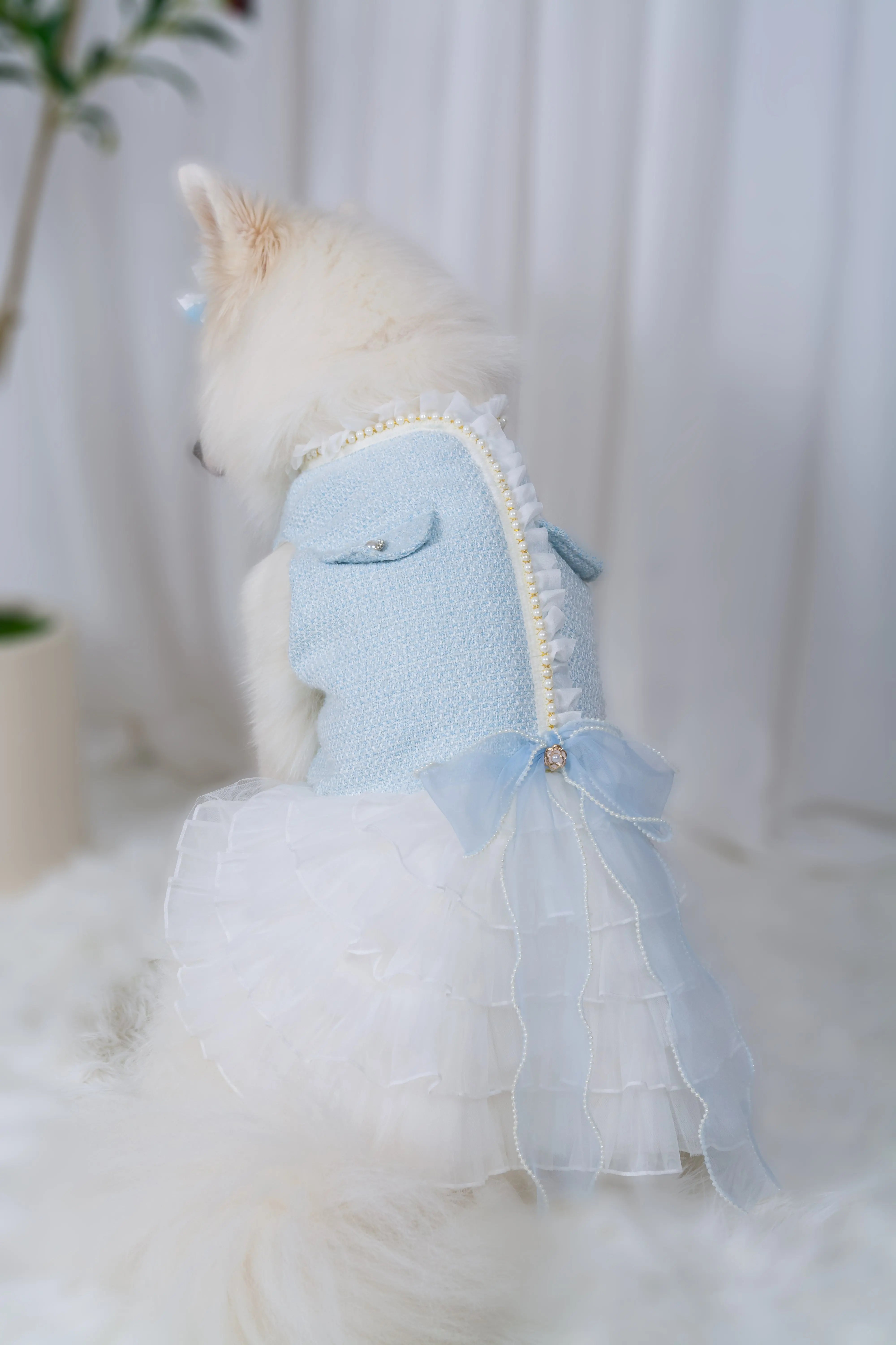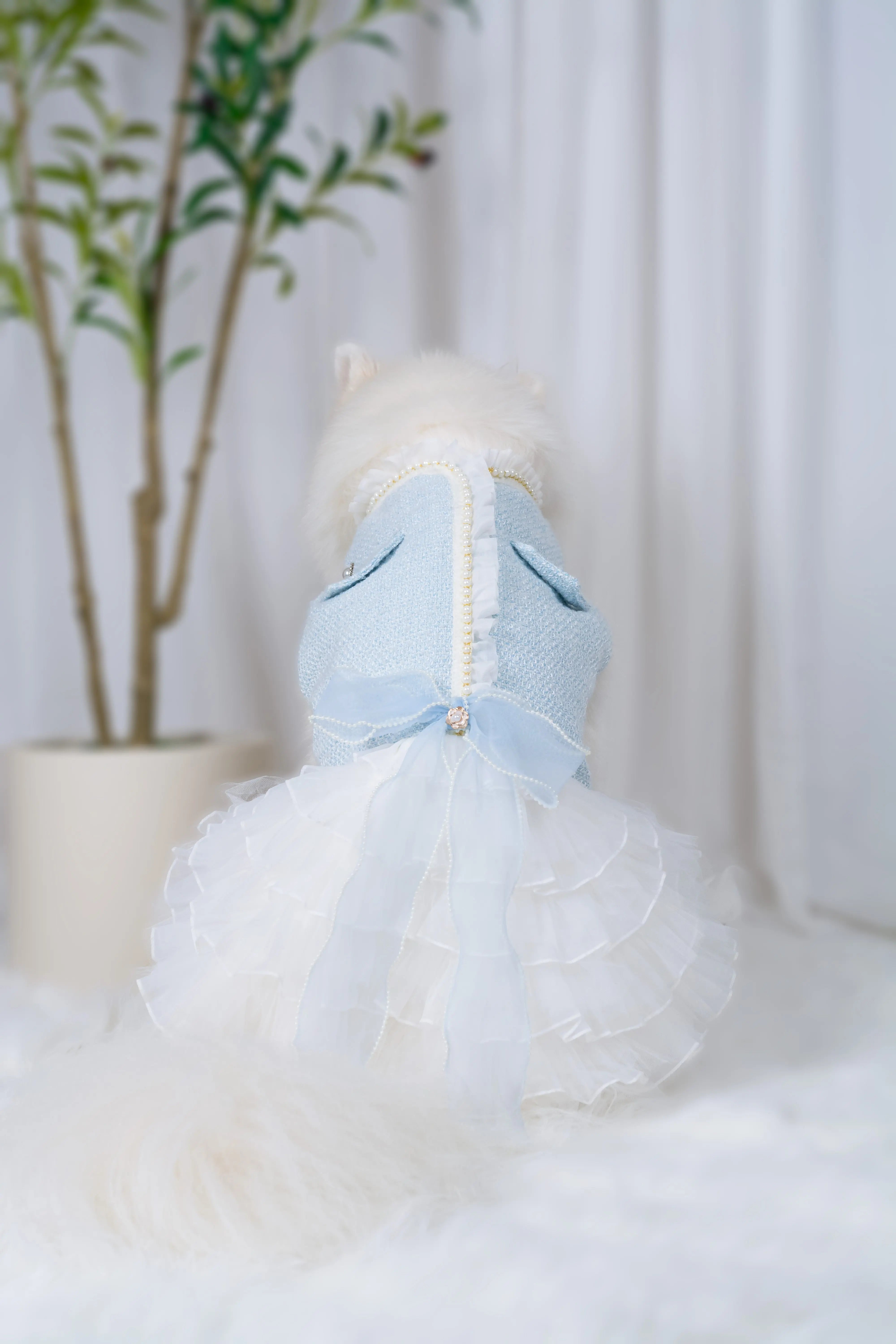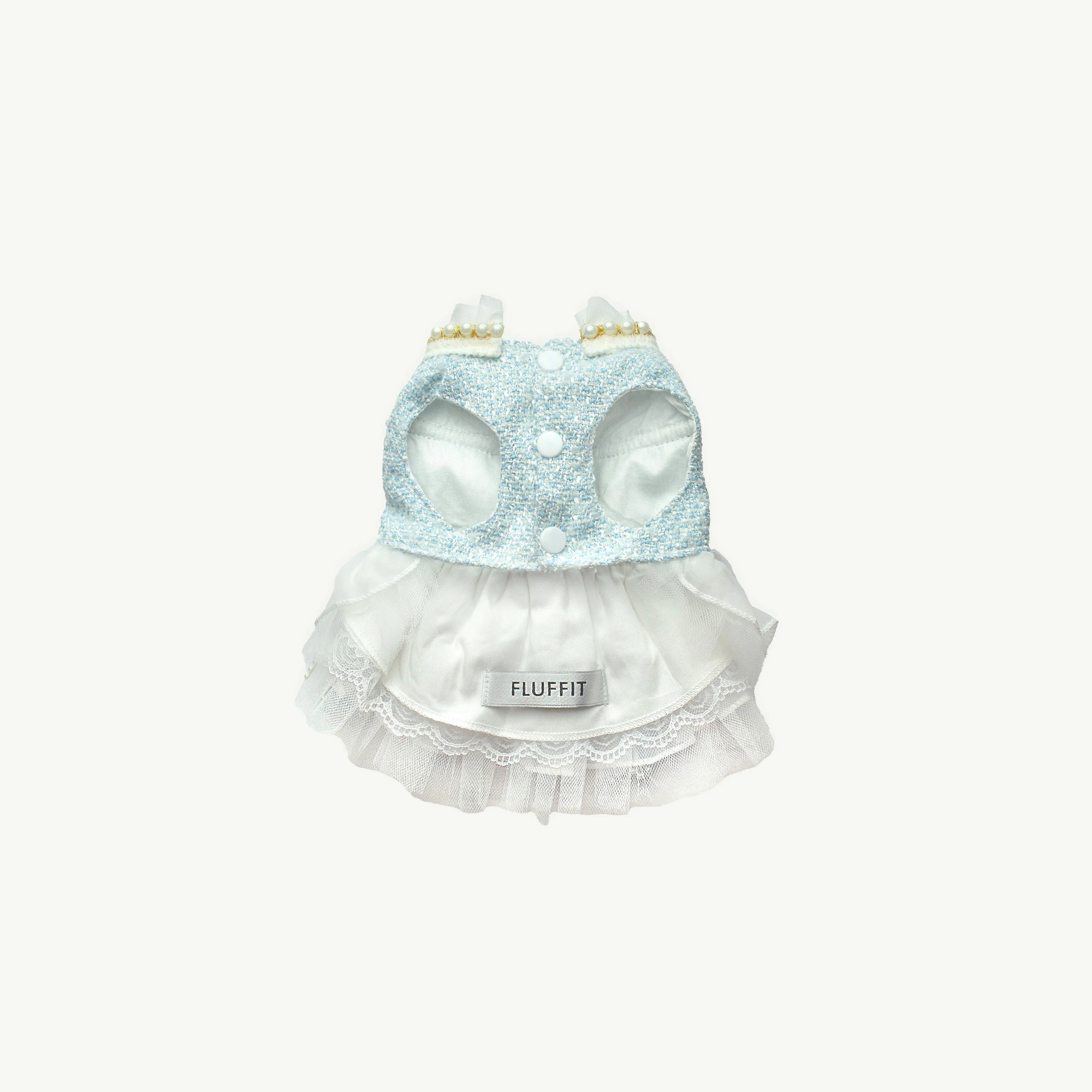 Tulle Society is crafted for the pet who commands attention without ever raising a paw. This piece features an icy blue tweed bodice adorned with pearl trim and heirloom-inspired buttons, perfectly contrasted by cascading tiers of soft white tulle. Finished with a blue organza bow laced in pearl strands, it’s a look that balances softness with strength. A signature staple in the Fluffit wardrobe, made for brunches, birthdays, and being unforgettable.